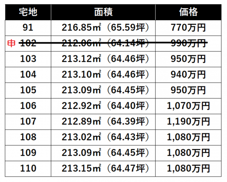 開発行為許可:岩手県指令都第10-7号(令和5年10月31日) 宅地91 216.85㎡(65.59坪)770万円 宅地103 213.12㎡(64.46坪)950万円 宅地104 213.10㎡(64.46坪)940万円 宅地105 213.09㎡(64.45坪)950万円 宅地106 212.92㎡(64.40坪)1,070万円 宅地107 212.89㎡(64.39坪)1,190万円 宅地108 213.02㎡(64.43坪)1,080万円 宅地109 213.09㎡(64.45坪)1,080万円 宅地110 213.15㎡(64.47坪)1,080万円 |