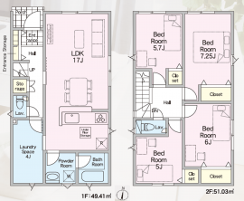 | 土地面積 | 実測 142.97㎡(43.24坪) | 建物面積 | 100.44㎡ (30.38坪) |