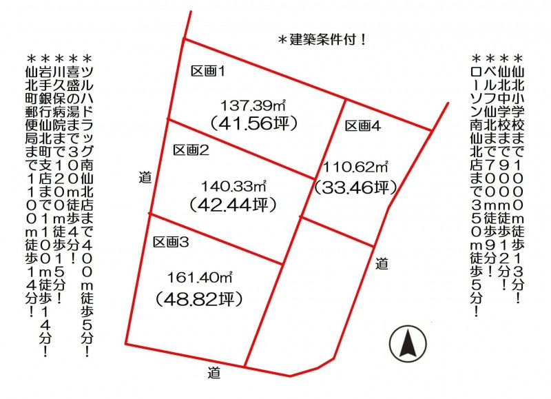 上下水道引込要、リーフ・デザイン様建築条件付 区画① 137.39㎡ 41.56坪 1,040万円 上下水道引込あり 区画② 140.33㎡ 42.44坪 1,060万円 上下水道引込要 区画③ 161.40㎡ 48.82坪 1,220万円 上下水道引込要 区画④ 110.62㎡ 33.46坪 900万円 上下水道引込要 |