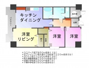 | 設備・条件 | システムキッチン、IHクッキングヒーター、シャンプードレッサー、洗浄便座、モニタ付インターホン、オートロック、角部屋、エレベーター、3口コンロ、エアコン、洗濯機置場、給湯、照明器具 | ||